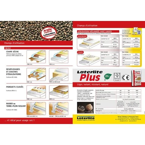 • Champs d’utilisation Adapté pour tous les usages de l’argile expansée Laterlite traditionnelle et en particulier là où on demande de faible présence d’humidité. -Sous couche d’égalisation, d’allégement et d’isolation pour la pose de parquets cloués -Chape sèche en rénovation de plancher sous des panneaux de bois ou plaque de plâtres -Chape sèche pour maisons ossature bois -Rénovation de plancher bois pour combler les espaces entre lambourdes -Béton de remplissage Utilisation à sec Sur le plan de pose on étend l’argile expansée Laterlite dans l’épaisseur souhaitée (en moyenne 5 à 15 cm), on la met à niveau, on la compacte et on la recouvre avec des plaques (bois-aggloméré, plaques de plâtre …), obtenant un travail propre, rapide, absolument sans l’usage d’eau et donc sans problèmes d’humidité. Pour une isolation phonique, désolidariser le long des murs. On peut insérer les canalisations ; laisser au moins 3 cm au-dessus des fourreaux. Utiliser 1 sac de 50 litres pour couvrir 1 m² sur une épaisseur de 5 cm. Ravoirage C’est le système le plus utilisé pour les couches d’allègement et d’isolation. On les réalise avec n’importe quelle bétonnière. En pratique, on utilise 3 sacs de bille d’argile (150 litres), le contenu de 1 sac de ciment (25 kg) et 10 litres d’eau. Ne pas rajouter de sable ni utiliser des quantités supérieures en ciment. Le mélange serait plus lourd et moins isolant. Préparation du mélange Mettre dans la bétonnière l’argile expansée Laterlite, du Ciment et graduellement de l’eau. Mélanger jusqu’à ce que chaque granulat soit recouvert d’une pellicule de laitance de ciment brillante (si elle est opaque ou poussiéreuse, ajouter de l’eau). Avec trop d’eau les granulats seront. Rajouter alors du ciment jusqu’à obtenir l’effet ci-dessus décrit. Séchage En été éviter un séchage trop rapide. Attendre au moins une semaine pour la pose de la couche de finition.