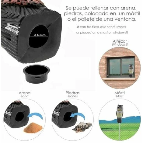 – La base de la chouette a un trou ( Ø 44 mm.) à placer sur un mât ou à remplir de sable ou de pierres.