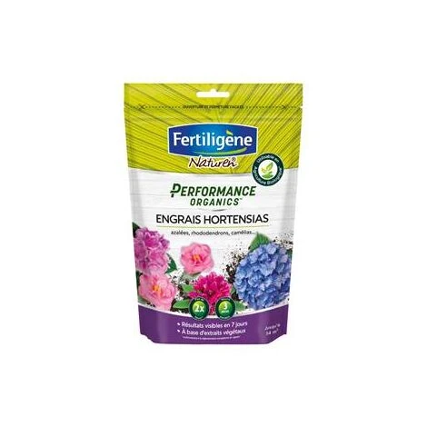- Le sachet de 700 g. Formule 100% naturelle utilisable en agriculturebiologique. L’engrais Performance OrganicsHortensias d’origine végétale et enrichi en guanomarin permet des résultats visibles dès 7 jours etnourrit vos plantes jusqu’à trois mois !Adapté à toutes les variétés de plantes acidophilesil vous garantit des résultats extraordinaires :2 fois plus de fleurs !ENGRAIS NF U 42-001 – Engrais organo-minéral NPK 7-5-8 + 2- 7 % d’Azote (N) total dont 5,9 % de tourteaux végétaux et de guano marin.- 5 % d’Anhydride phosphorique (P 205) total – 8 % d’Oxyde de Potassium (K20)total 3% soluble dans l’eau. – 2% d’Oxyde de Magnésium (MgO) total.