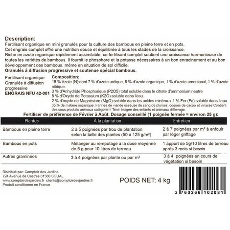 - Fertilisant complet spécialement formulé pour satisfaire l’intégralité des besoins des bambous et graminées.
