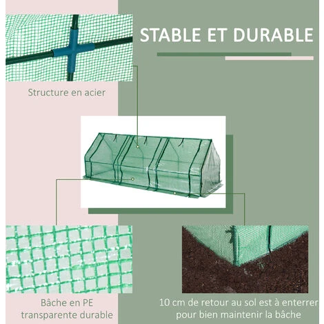 Cette mini serre de jardin protègera efficacement vos plantes afin d’en tirer le meilleur rendement possible. Equipée de 3 fenêtres déroulantes avec zip et cordons de maintien, d’une structure an acier thermo-laqué, et d’une bâche rallongée, vous pourrez sereinement lancer votre nouvelle production agricole.