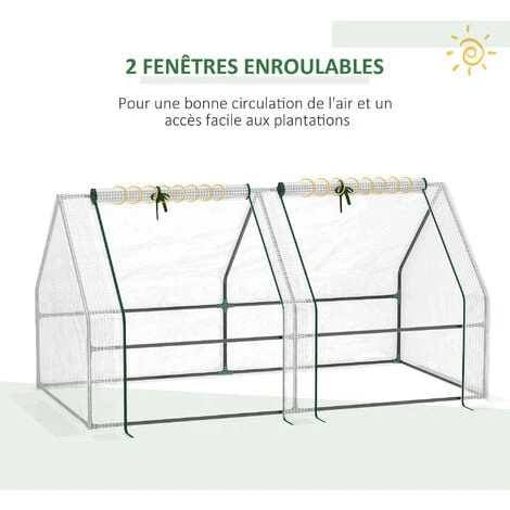 – Bâche transparente en polyéthylène imperméable anti-UV haute densité 140 g/m² rallongée d’une dizaine de cm pour un meilleur maintien au sol