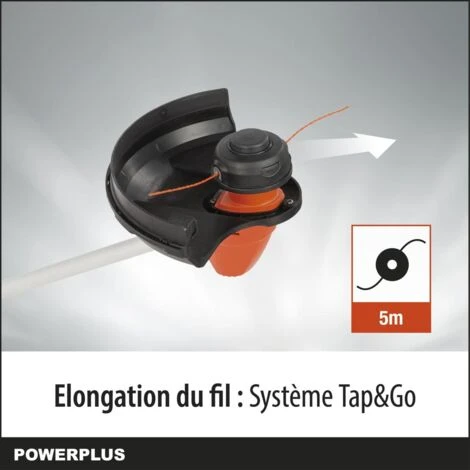 Tap & go : La tête de coupe est équipée d’un système « tap & go ». Il suffit de taper légèrement le fil sur le sol pour qu’il s’allonge automatiquement.