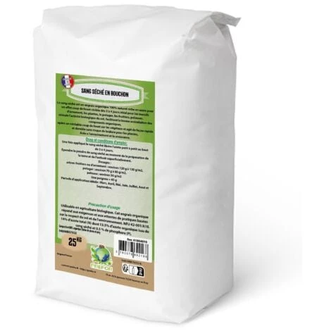 Le sang séché, matiere organique d’origine animale, est un engrais a libération rapide : effet au bout de quelques jours, les effets sur les plantes peuvent etre spectaculaires ! Spécialement conseillé pour gazons (1 Kg/ 25 m2) et rosiers au printemps. Ne génere pas de brulure pour les plantes, évite une pénétration profonde de nitrates dans les sols, peut etre utilisé en période de croissance : renforce et stimule au potager. Activateur de compost. Conseil d’utilisation : Dosage (plantation – entretien): Massifs de vivaces : 3 poignées par m² Arbustes : de 2 a 5 poignées par arbuste en fonction de la taille. Arbres : Jusqu’a 6 poignées pour un arbre adulte. Légumes verts, crudités : 1/2 a 1 poignées par m². Gazon : 2 poignées par m², apres la 1ere tonte. Rosiers, tomates, aubergines, poivrons…: 1/2 a 1 poignée par plante a la plantation ou a la reprise de la végétation. Evitez les apports avant la floraison et la fructification. Composition : Utilisable en Agriculture biologique en application du RCE n°834/2007 Composition moyenne sur brut : 14% d’Azote (N) total 100% organique Origine : Farine de plume hydrolysée ? oe poudre de sang. Les ++ produits : NPK :14.0.0 Riche en Azote Libération rapideFabriqué en FranceCouleur naturelle, sans colorantsBiodégradable et sans danger pour l’environnement