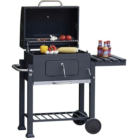 - Couvercle à revêtement par poudre avec poignée en acier inoxydableTablette latérale revêtue de poudreBac d’incendie à revêtement par poudreCuve à charbon de bois émaillée, réglable en hauteur par manivelleBac à cendres avec revêtement par poudre avec poignée en acier inoxydablePoignée de chariot intégrée dans la tablette latérale4 pieds thermolaqués2 roulettes en plastiqueTablette avec revêtement par poudreHauteur de travail env. 85 cmCapacité charbon de bois : max. 0,8 kgBreveté