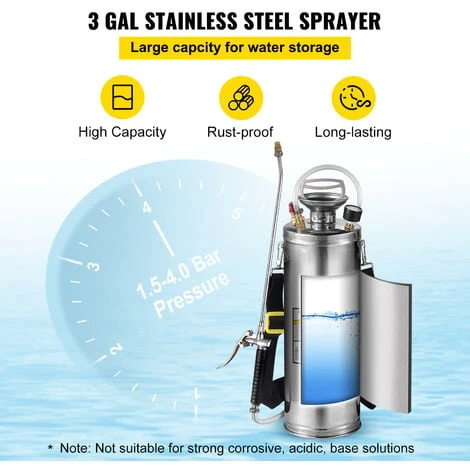 Acier Inoxydable Durable : Capacité : 10 L, pression : 1,5 – 4,0 bar. Le pulvérisateur est fabriqué avec acier inoxydable, il est résistant à la rouille et durable. Attention, l’anneau en caoutchouc et la conception interne ne conviennent pas aux solutions fortement corrosives, acides et basiques.