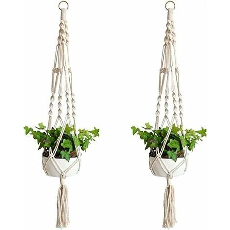 Ce porte-plante est fait de corde de coton et est fait à la main.
